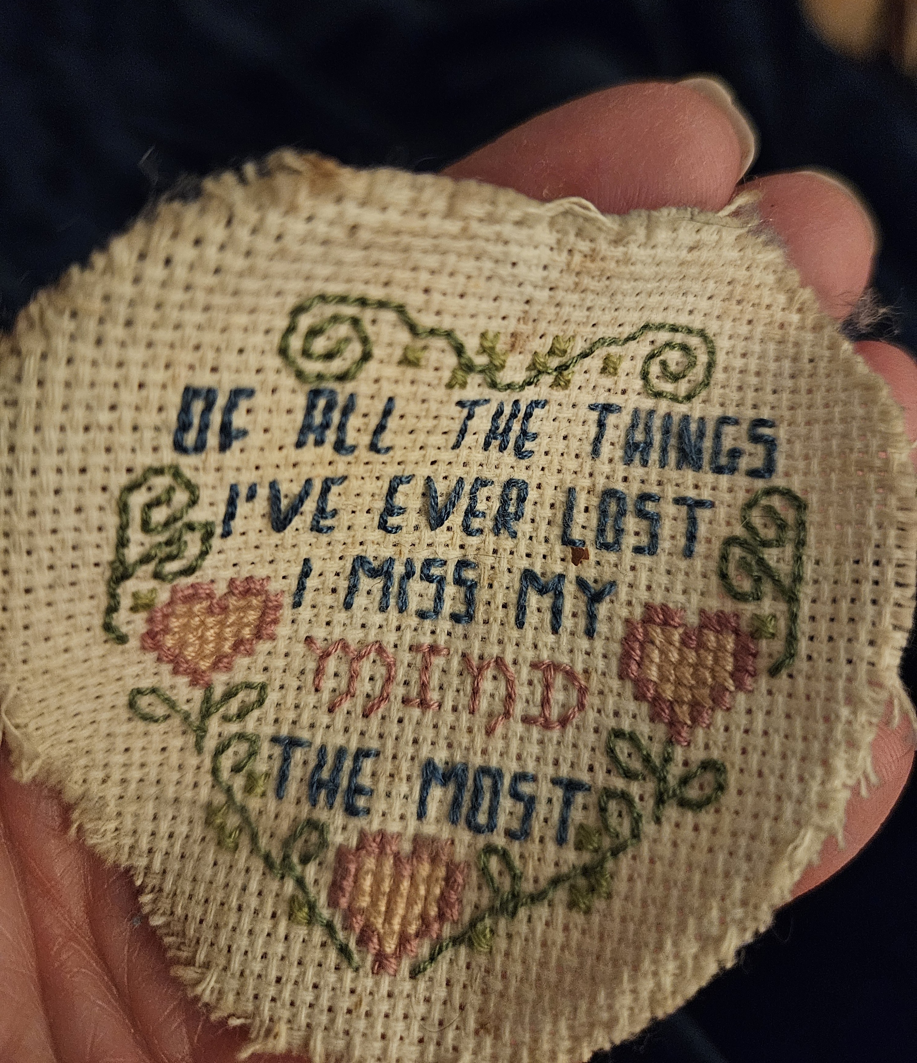There are many things that I’ve lost over the years, but I really wanted to find this little piece of cloth, an embroidered saying I made probably 30 or 35 years ago… and I found it after cleaning and cleaning and cleaning… “Of All the Things I’ve Lost, I Miss My Mind the Most”… yeah…