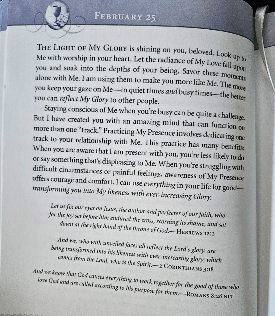 Staying conscious of Me when you’re busy can be quite a challenge. But I have created you with an amazing mind that can function on more than one “track”. Practicing My Presence involves dedicating one track to your relationship with Me. This practice has many benefits: When you are aware that I am present with you, you’re less likely to do or say something that’s displeasing to me. When you’re struggling with difficult circumstances, or painful feelings, awareness of my presence offers courage and comfort. I can use everything in your life for good – transforming you into My likeness, with ever-increasing Glory.