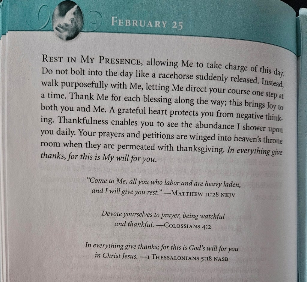 Rest in My Presence, allowing Me to take charge of this day. Do not bolt into the day like a racehorse suddenly released. Instead, walk purposefully with Me, letting Me direct your course one step at a time. Thank Me for each blessing along the way; this brings Joy to both you and Me. A grateful heart protects you from negative thinking. Thankfulness enables you to see the abundance I shower upon you daily. Your prayers and petitions are winged into heaven’s throne room when they are permeated with thanksgiving. In everything give thanks, for this is My will for you.