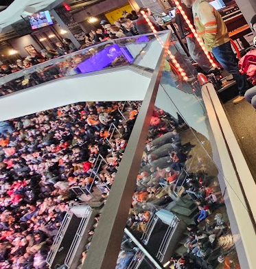 The seats were a single row with a panoramic view – theatre style – and protected by the clearest of clear plexiglass – thick too – safe for us to stand up and not feel like we would fall. (I’m not afraid of heights – but maybe some would be.) And there was a nice lounge behind us too – with food and lots of people not watching the game except a glimpse on a TV monitor. I watched the first period, gabbed with friends all the way through the second period, then sat down and watched the thrilling 3rd period (our local team won! but both team fans, in our mixed crowd, were excited at the exciting game)… In general we were all happy to be there!