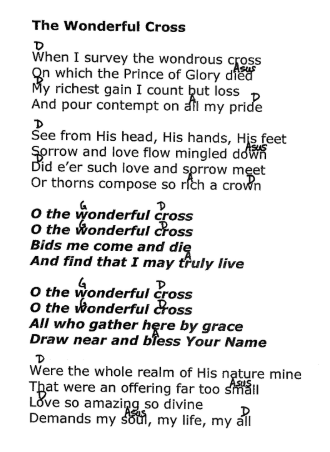 PS – the chorus included in our praise band version has the lifting tune that I hum: “Oh the Wonderful Cross – Oh the Wonderful Cross – Bids Me I come and Die – And find that I truly LIVE.”
