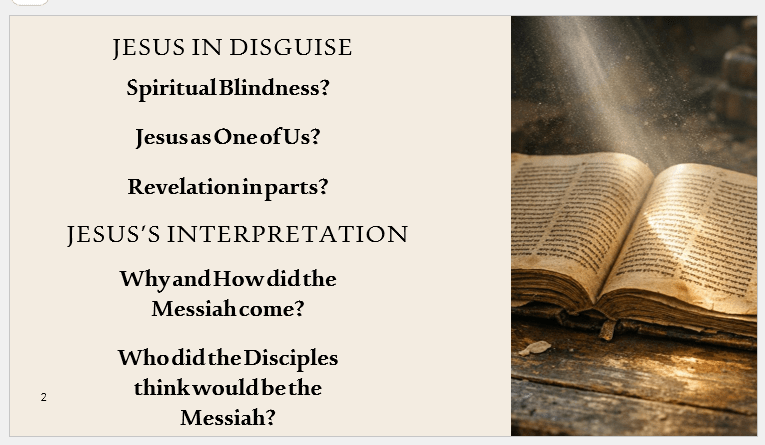But why would Jesus need to be in DISQUISE before He was revealed – is it to remind us of our own Spiritual Blindness? Or perhaps we listen better when we are hearing from one of us – a equal who speaks our language – and certainly Jesus, although not equal, humbled Himself to come down to be poor – to be raised by poor folks – to be amongst the people who would learn from Him and no one could dispute that these people would not have learned this information or be transformed by some non-Holy entity. And remember that Jesus gave this information in parts – His Revelation was in parts – not to overwhelm – not to lose them with too much info – not to go “Over their heads” – but instead engage them in conversations and let the info soak deeper into their understanding. Actually they may have had all the information but it wasn’t put together in their heads.