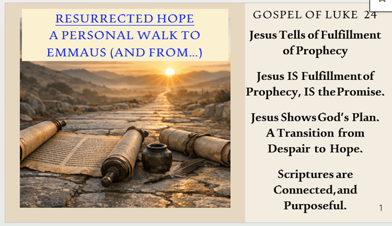 So, let us start travelling On the Road to Emmaus – from the Gospel of Luke 24 – Luke was a person who interviewed everyone – he must have learned so much from these two.