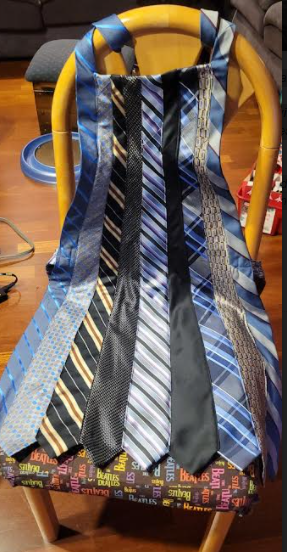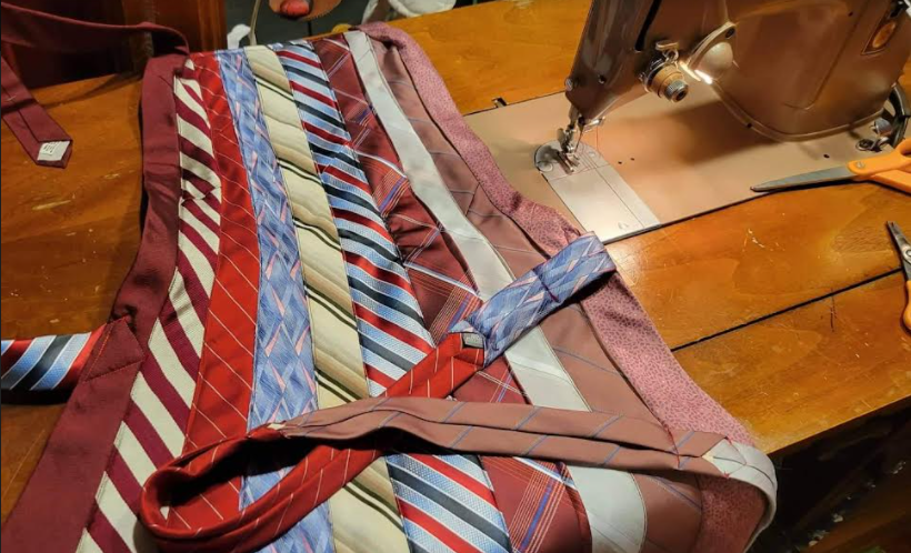 It is quite the unique way to remember a loved one who has passed, by sewing their neck ties into aprons. This is the project that my friend came to use my sewing machine for this past week before Christmas. She pinned and I sewed. The wide-ness of the tie creates the skirt, the inner thin pieces become the apron strings to wrap around the neck and waist. Love the colors.