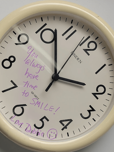 ATTACHED IS A PHOTO OF MY OLD CLOCK – THE CLOCK THAT HUNG IN MY OFFICE SO MANY YEARS AND WHEN I LEFT THE BUILDING (to go to the new building) THEY TOOK IT FOR THE “CLOCK WALL” – MY FRIEND HAD ME SIGN IT – I SIGNED IT WITH MY CATCH PHRASE “YOU ALWAYS HAVE TIME TO SMILE”