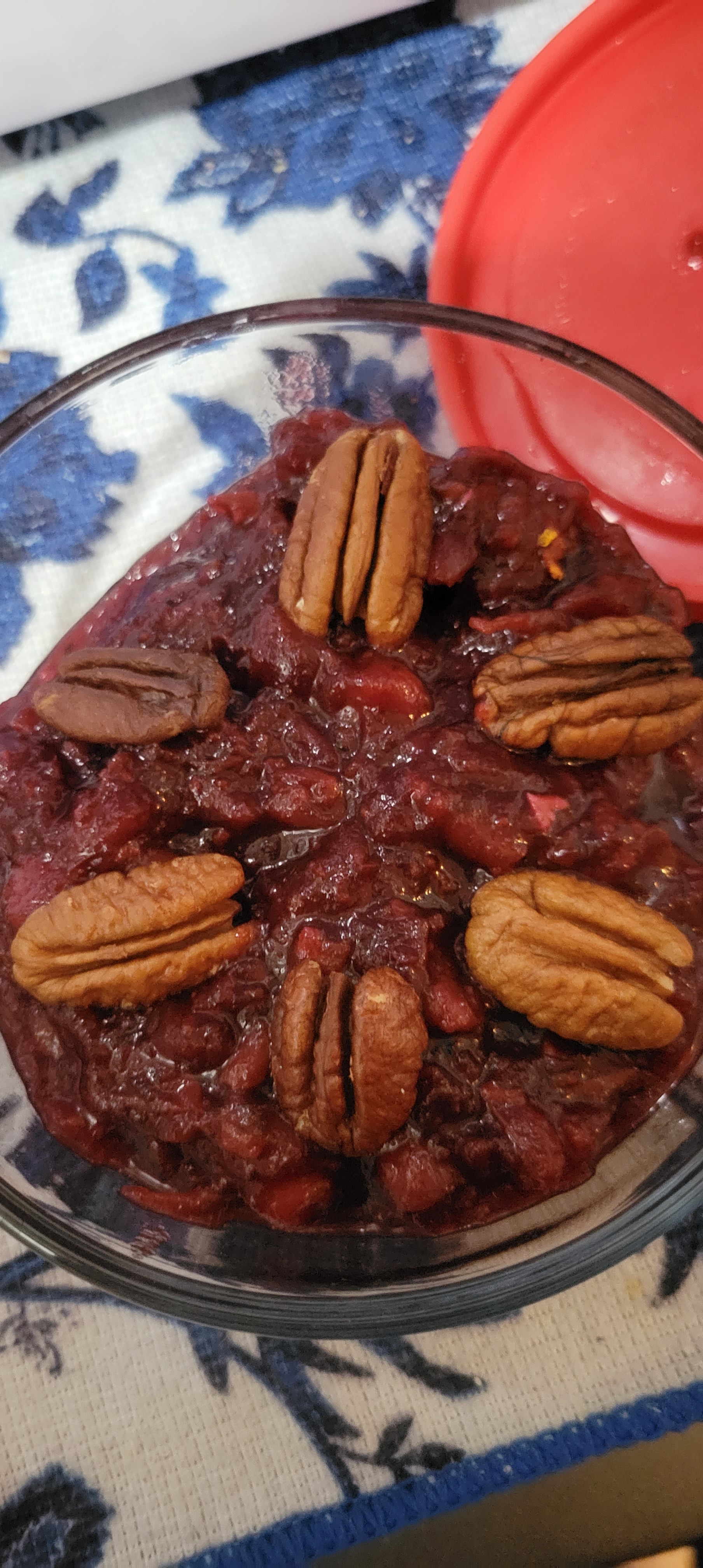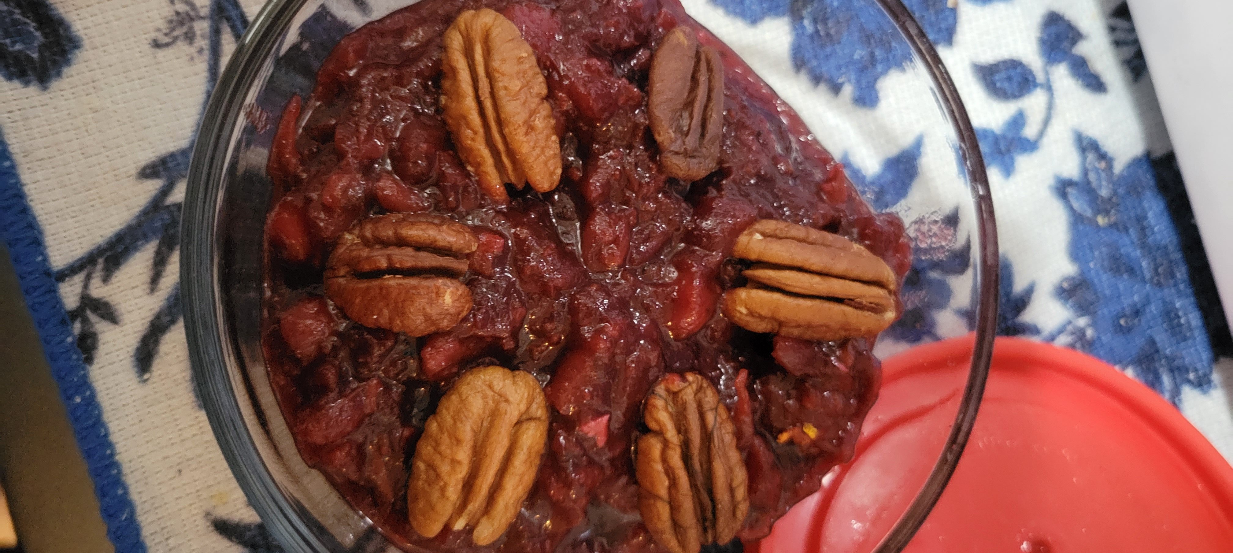Boil one bag cranberries with half cup water and half cup maple syrup and zest of one orange. Boil until they open, about 5 minutes, few minutes more and use gentle persuasion with a fork to open the resistant ones… Toast a cup of pecans dry in a skillet. Add the pecans and juice of one orange. Enjoy! Serve warm or cold. Refrigerate extra. YUM!
