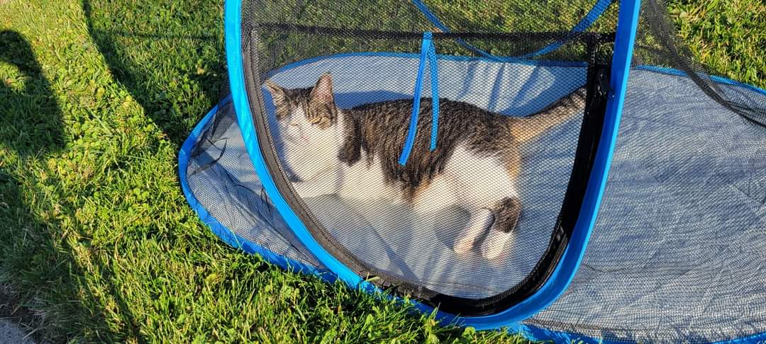 And it was warm out, and the cat enjoyed it in her tent, except then it started to rain. This cat doesn’t appreciate rain.