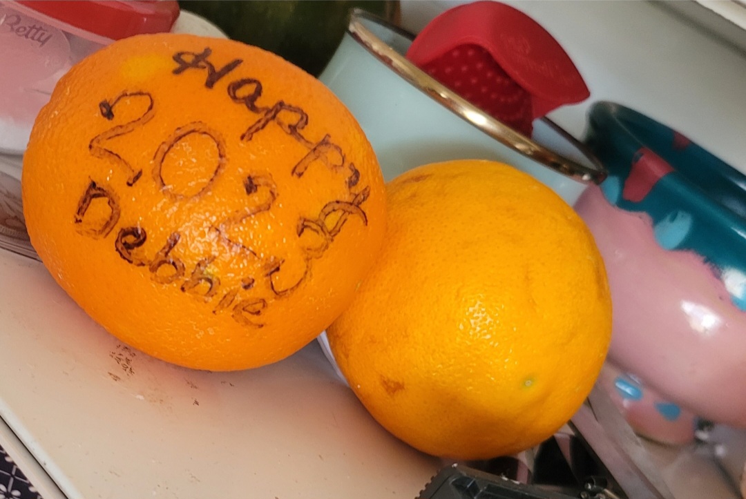 A friend brought me a new juicy-looking orange for 2023 on New Year’s Day all while reminding me to hunt for that old one lost in my purse that I wrote about yesterday (https://debbieupper.blog/2023/01/02/happy-new-year-one-day-and-one-step-at-a-time/ ). I did find it, still tempted to eat it because it’s not TOO old. But now that I have a new orange, should it be “out with the old” everything? Well not too sure about that, and certainly not before I took a photo… Carrying over old into a new year is not necessarily bad… I can at least try the juicy old fruit that took so long to develop, if not I’ll compost it back to the soil.