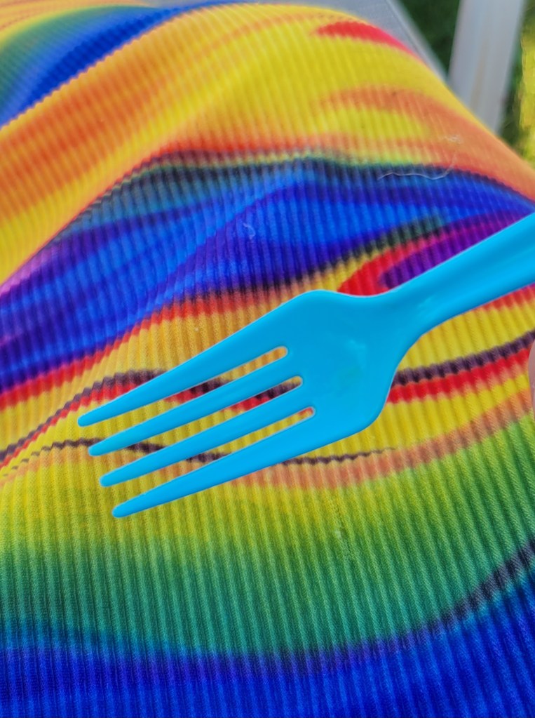 We stayed safe in the nice breeze that day, outside IS the best. The food, however, was inside, hmmm… Insects vs covid caution? Insects are ALWAYS a bugaboo. I dashed inside for a moment, quickly grabbed a takeout plate, and this blue fork. I risked it, food over fear, friendship over fear, just I’m a risk-taker normally, I mean I risked spaghetti-sauced meatballs in the car, but I knew my chances of COVID catching were very minimal (in my opinion and scientifically) by only 5 minutes inside. How human of me, of course, my stomach overtook in influence… And it’s OK to know that it is human nature to worry, and it’s human nature to not be cautious enough. We don’t want to be flippant ignorant of what others worry about. (You don’t have to grandstand for meatballs). You can also take a pass, fast even and say I wouldn’t eat them now anyway. (Isn’t that what fridges are for?)