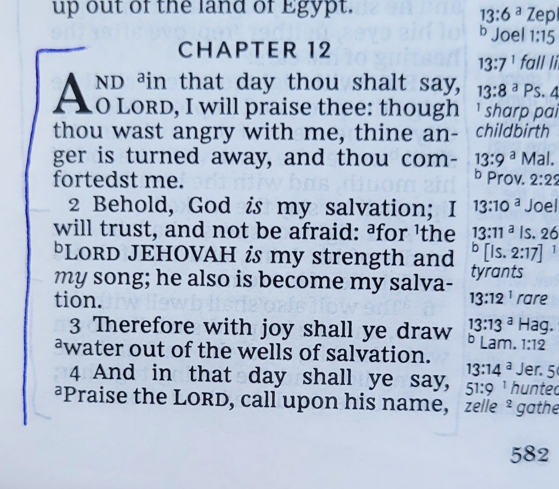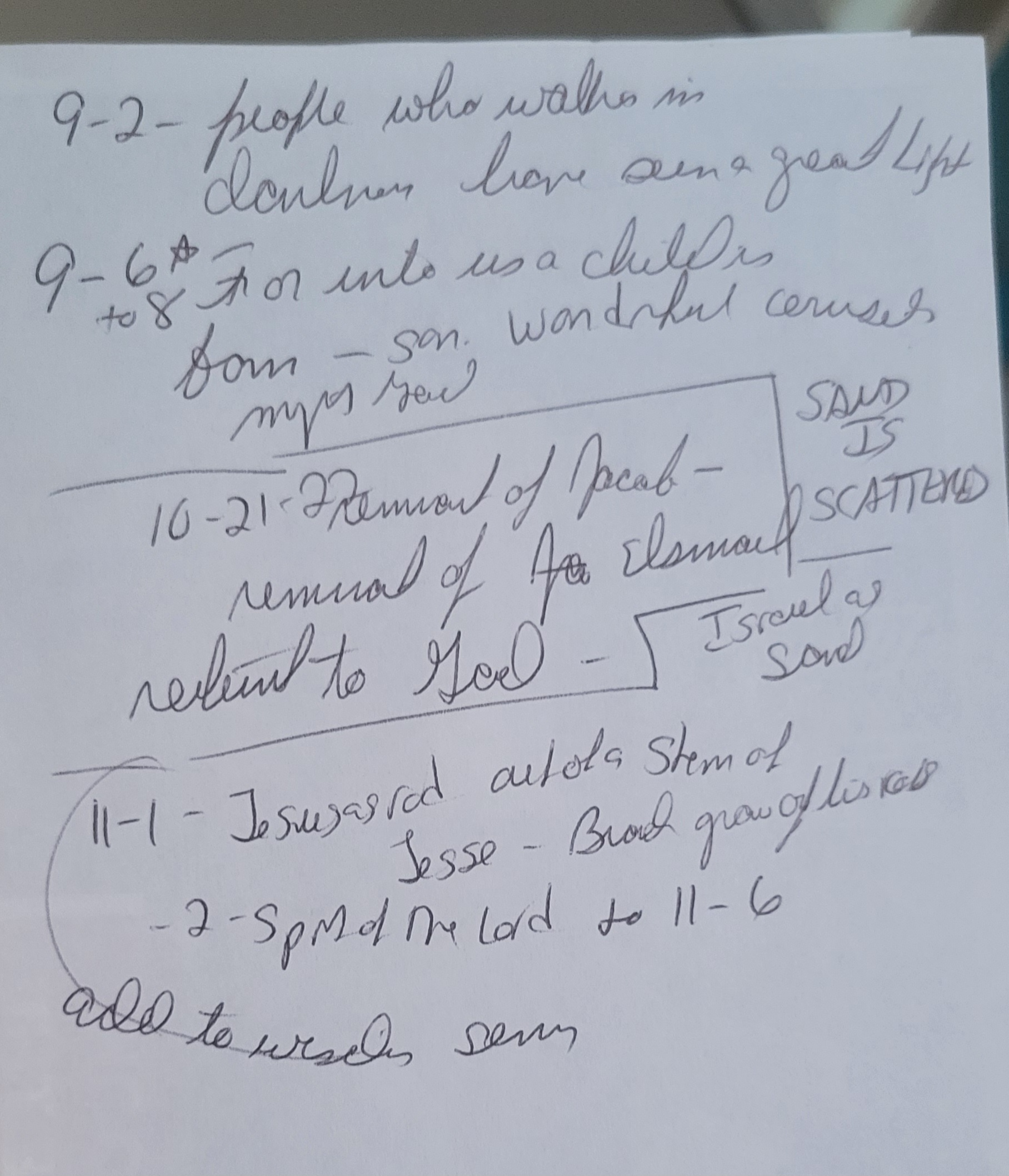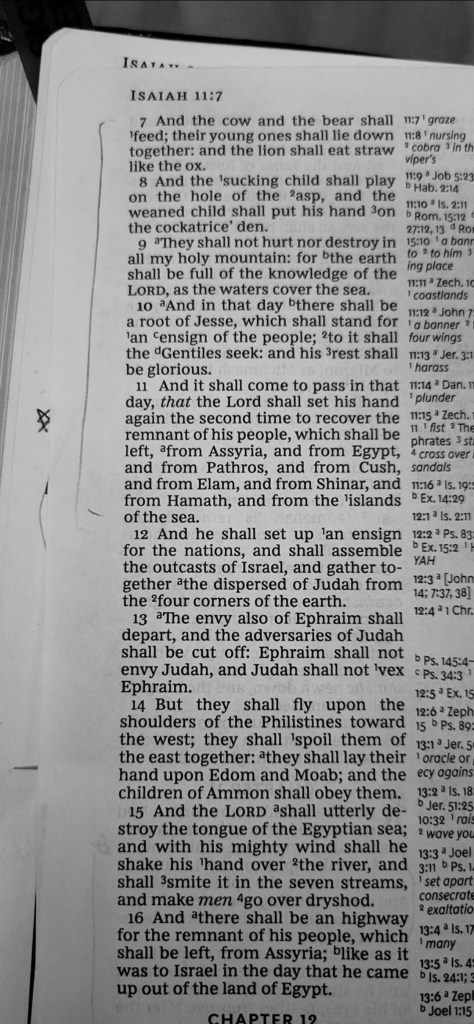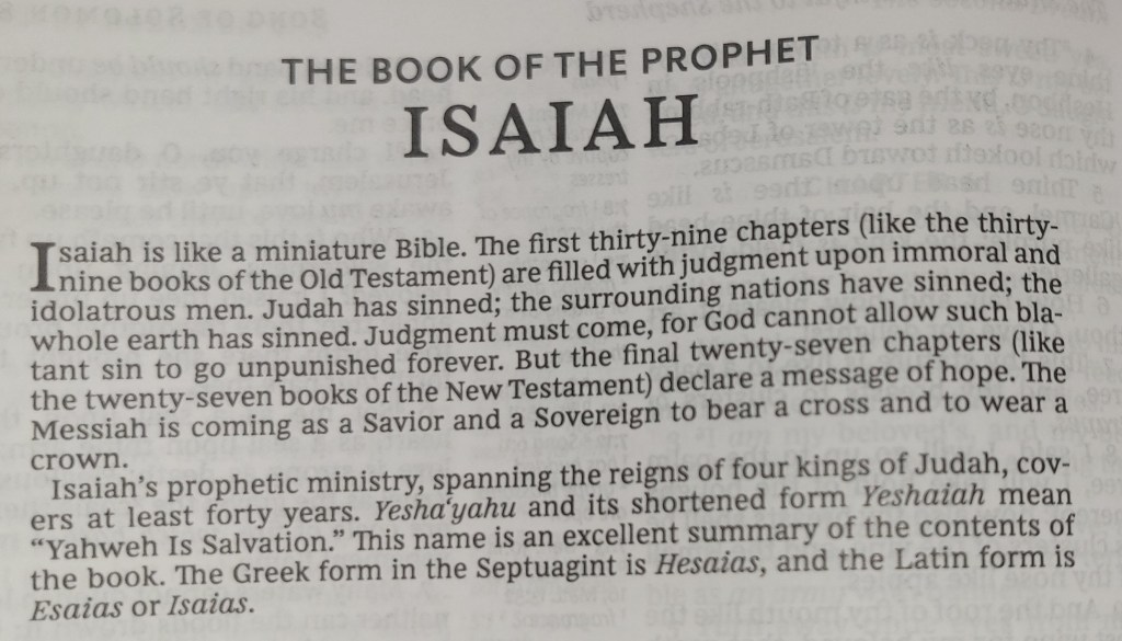 Isaiah – oh – an explanation of what Isaiah was writing about, same as Genesis and the whole Bible: Jesus was needed. Jesus was coming. Jesus would/did/will WIN. Quoting from my bible’s book preface: “Isaiah is like a miniature Bible. The first thirty-nine chapters (like the thirty-nine books of the Old Testament) are filled with judgement upon immoral idolatrous men. Judah has sinned; the surrounding nations have sinned ; the whole earth has sinned. Judgement must come, for God cannot allow such blatant sin to go unpunished forever. But the final twenty-seven chapters (like the twenty-seven books of the New Testament) declare a message of hope. The Messiah is coming as a Savior and a Sovereign to bear a cross and to wear a crown. “