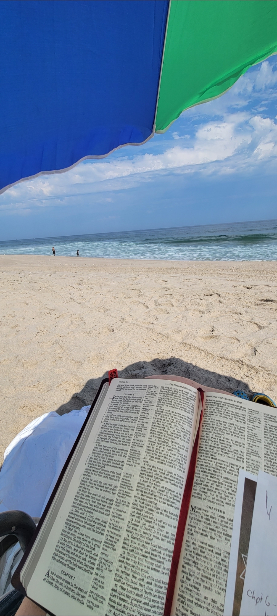 Cool… so I read chapter 1 thru 11 whole chapters… not all at once, got some swimming and napping in, and I took physical notes for later. The paper Bible on the beach was both necessary and neat, as my phone battery never would last as long as the Word.