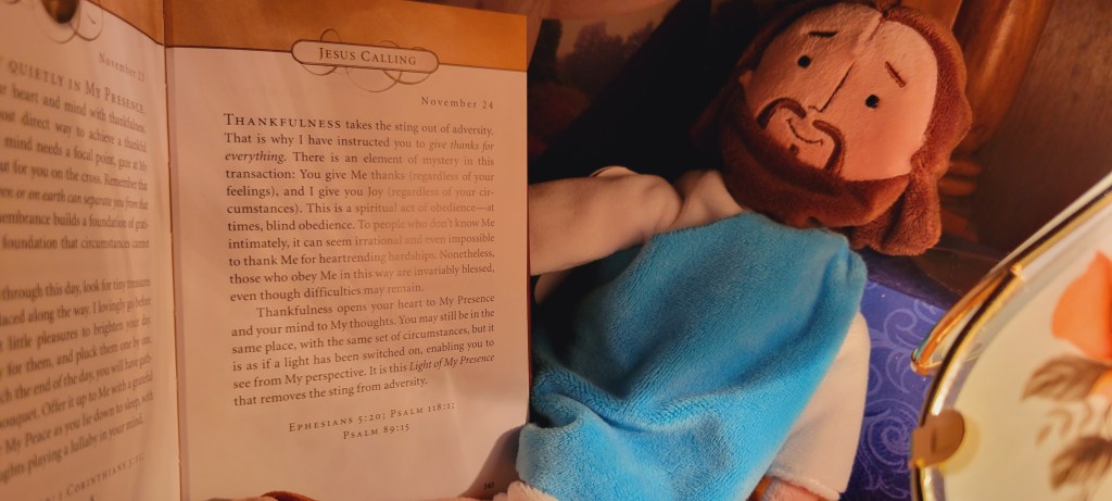 Nov 24 Jesus Calling: “Thankfulness takes the sting out of adversity. That is why I have instructed you to give thanks for everything. There is an element of mystery in this transaction: You give Me thanks (regardless of your feelings), and I give you JOY (regardless of your circumstances). This is a spiritual act of obedience — at times, blind obedience. To people who don’t know Me intimately, it can seem irrational and even impossible to thank Me for heartrending hardships. Nonetheless, those who obey Me in this way are invariably blessed, even though difficulties may remain.