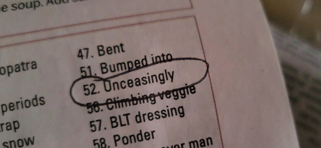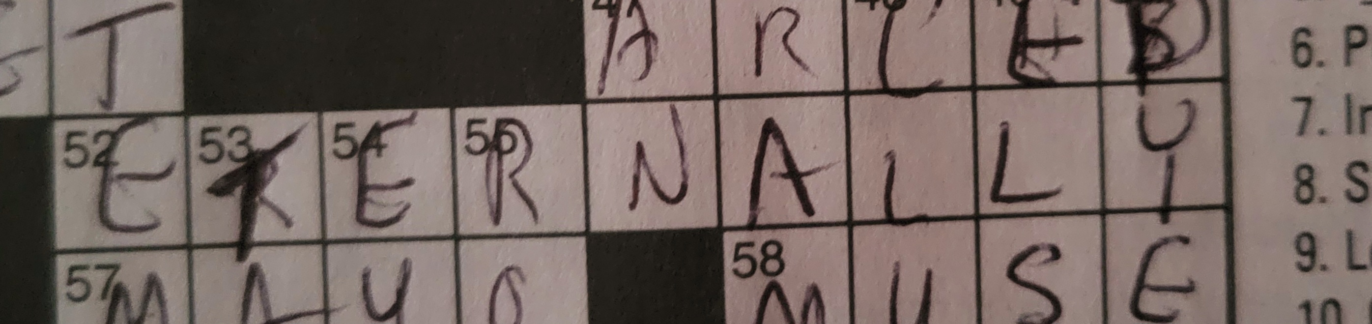 Then I know God got a good laugh from the angels at the repetitive lesson that next day (thankfulness is a way to pray without ceasing), because both He wants us to know this lifestyle each day and the angel laugh because that same sentiment arose in the crossword puzzle later that day. Oh yeah, clue 52 (fittingly a special number to my earthly distractions), “UNCEASINGLY” – and the answer is “ETERNALLY”. Cute God, cute.
