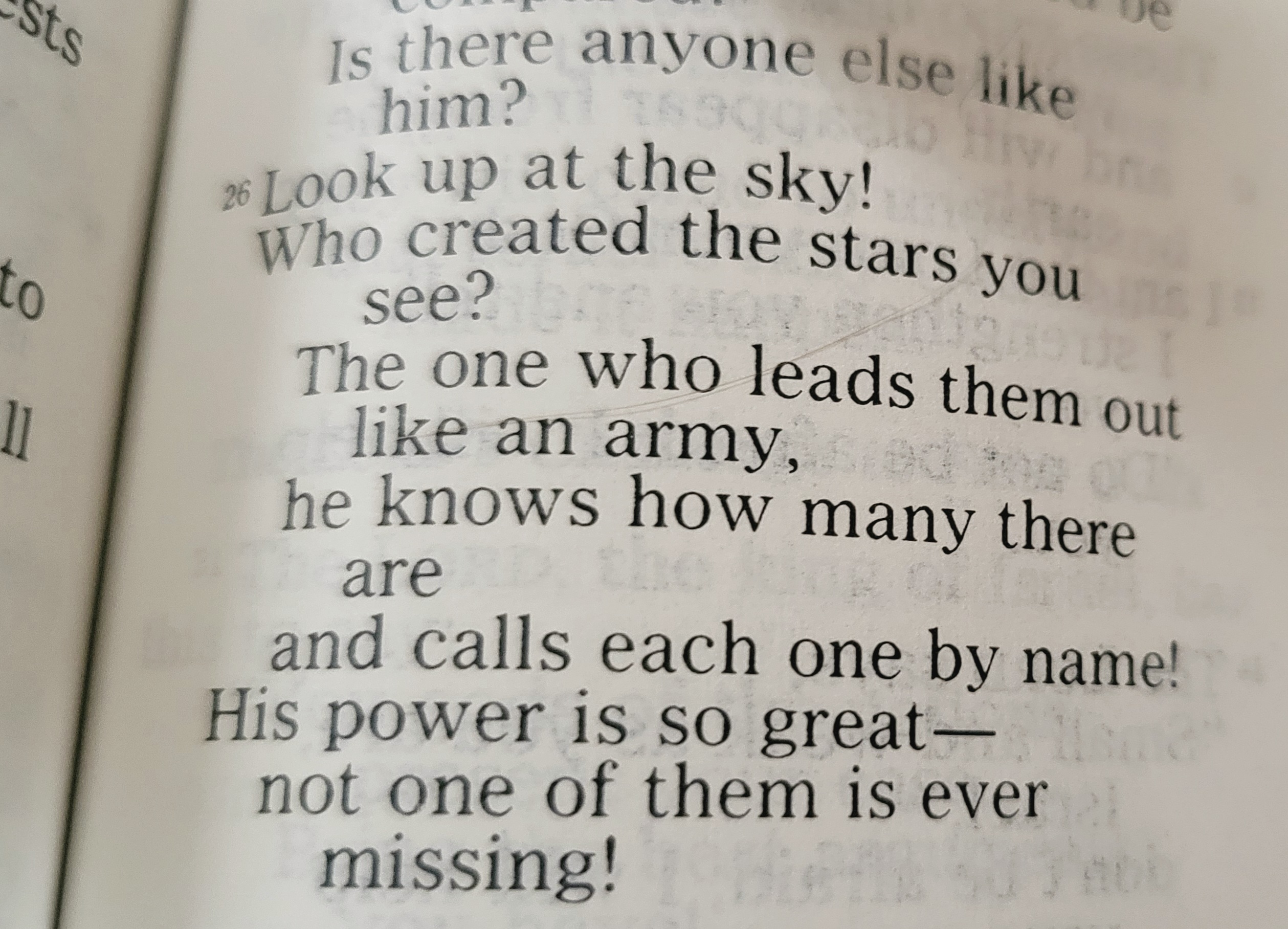 Lift up your eyes on high and see: who created these? He who brings out their host by number, calling them all by name; by the greatness of his might and because he is strong in power, not one is missing.