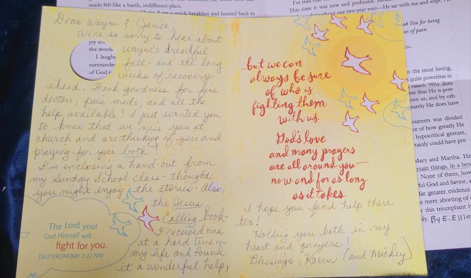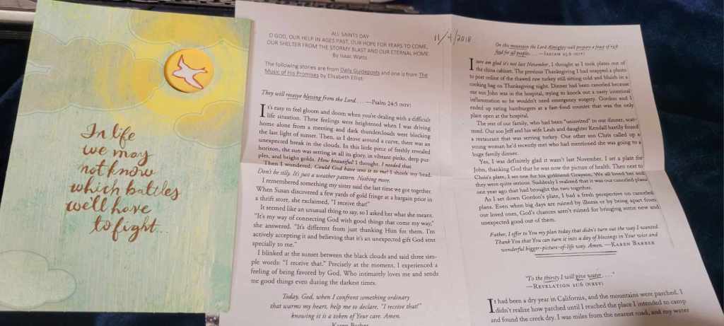The first scripture on the paper is Psalm 24:5 “they will receive a blessing from the Lord. “ …. YEAH! On the card, it says on the front cover: “In life we may not know which battles we have to fight.” And inside a reminder that God goes with us. (Fitting for this card went to a couple whose husband was recovering from a bad fall) And inside: the scripture is Deuteronomy 3:22 “The Lord God himself will fight for you“… YES! The paper insert is a set of devotions from Guideposts shared at a Sunday school class, especially fitting about a missed Thanksgiving dinner from illness which yielded unexpected blessings the following year that came about BECAUSE of the missed event and the backup plans that got good things going in motion. God works in mysterious ways, YES!!!