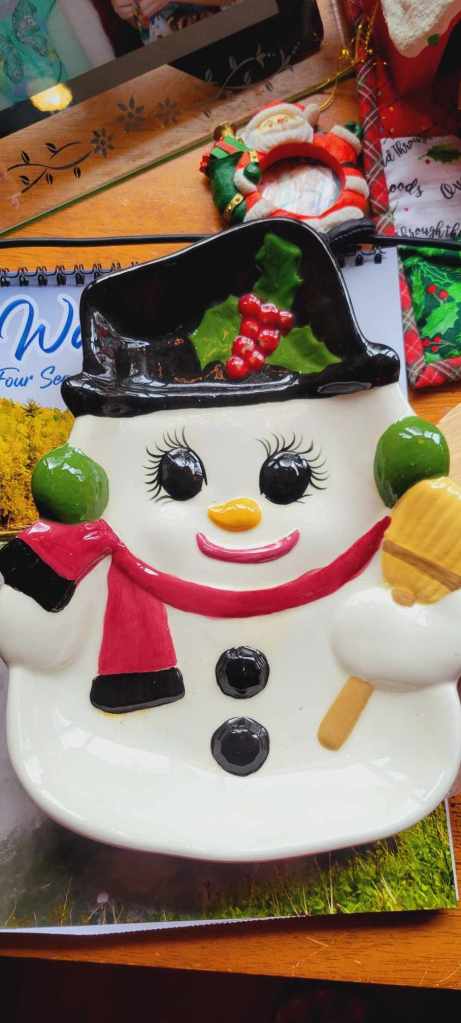 It’s Christmas JOY plus some jolly-ness that touches us, makes us smile. My mom blessed me with not just gifts but the fact that she PREprepared gifts that she PREwrapped before thanksgiving, when I visited her last, and handed me the bag to save on mailing. I truly felt blessed to still have my mom – and surely blessed when I unwrapped a smiling snowman dish from my mom, that I truly know I am blessed to feel that love. It’s a trinket thing but given in real love. (and it is a serving plate too – to serve up some love and joy and jollyness too)I am holding quite a few people in my prayers these days who recently lost their moms. I also know other strained family relationships which are broken down in strife and tears, which adds to blue Christmas times. Truthfully, it’s a hard Christmas for many. Forgetting feels easier than forgiving. And so with humbleness we are to appreciate our family moments that do actually come together. We also cherish peace and cherish those family-to-us friends and neighbors whom God has blessed into our lives. We appreciate relationships that don’t become “needs” but are appreciated as “gifts”.