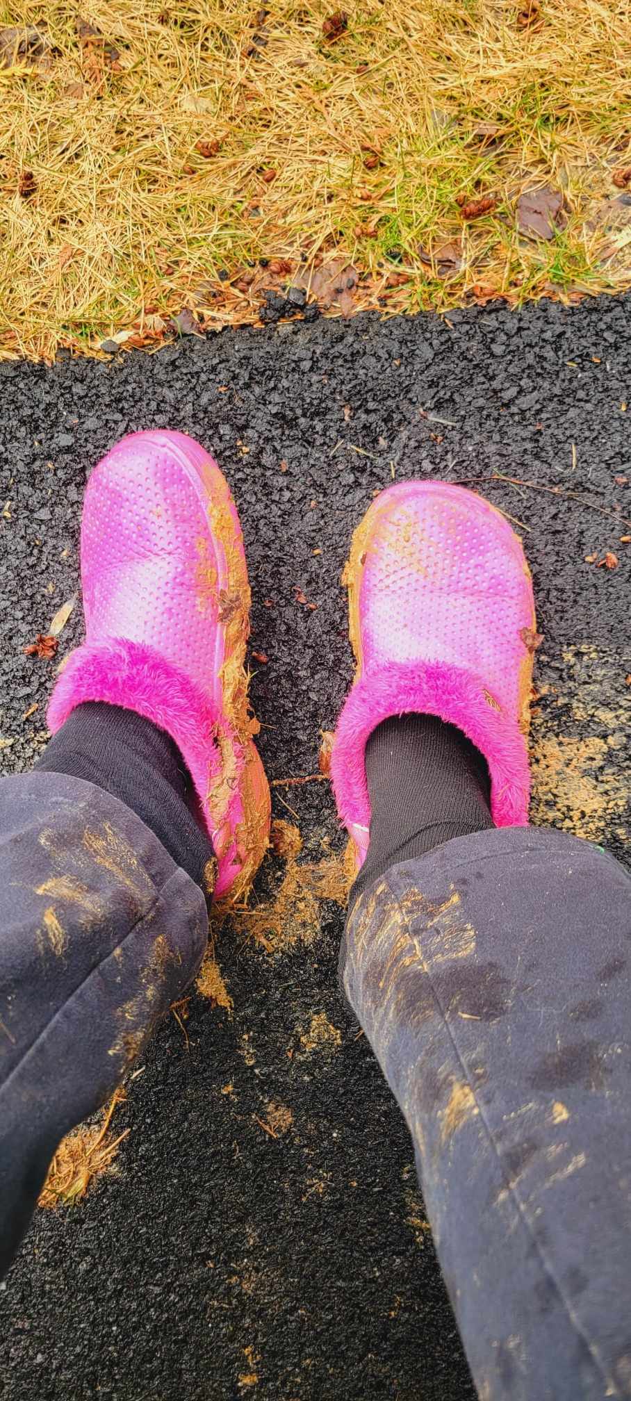 Mud – I carried out the work then later saw the mud – the smother of mothering now the smother of mudddddd-ering … mud… felt good (even looked good I thought for a photo,  the contrast of my pink fuzzy crocs as if happily dipped in mud). – Well…