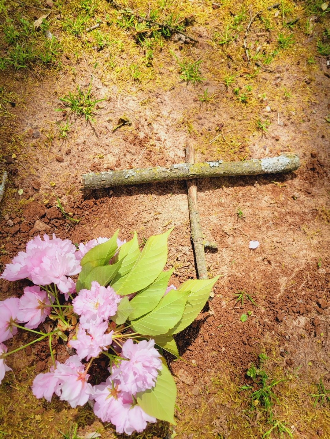 I buried Christmas and placed a few sticks as a cross. My friend brought some flowers and I placed a whirlygig, nice colorful pinwheel nearby. My hope is someone else to smile, see the colors, and hopefully feel the Holy Spirit move. May we all feel the JOY of the Holy Spirit.
