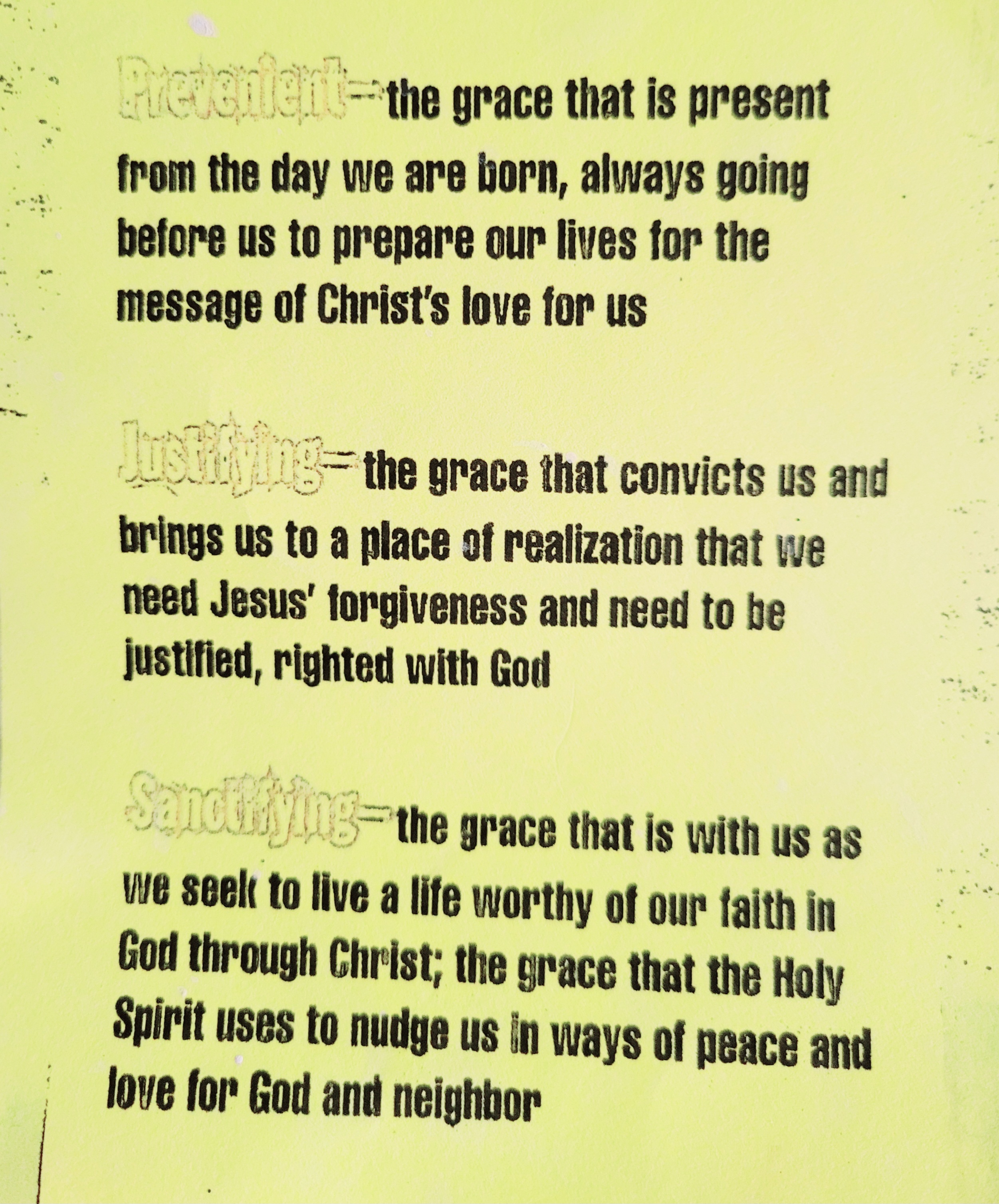 Funny House – I appreciated the talks before mine – and my talk was number 13, one of many fun numbers in my head for God and me – so in talk 12 the pastor-presentor spoke about the example of a house for stages of grace: Prevenient Grace (before we knew it – on the doorstep of the house), Justifying Grace (Just as if I’d never sinned – like being in the door frame), and Sanctifying Grace (you are completely inside – having chosen to walk through the door)… WELL, I told our speaker that God set up my ‘house example’ of Grace like a FUNNY HOUSE, and those days of unbelievable God sightings, the strikes to my disbelief system, THE CHRISTMAS FLOOD, found me holding onto the door jam while God tipped the house and shook it until I had no choice but let my fingers go and LET GO, right into Grace-acceptance, fall right… from asleep to a ‘sanctified faith’ – yeah God, I got it now…