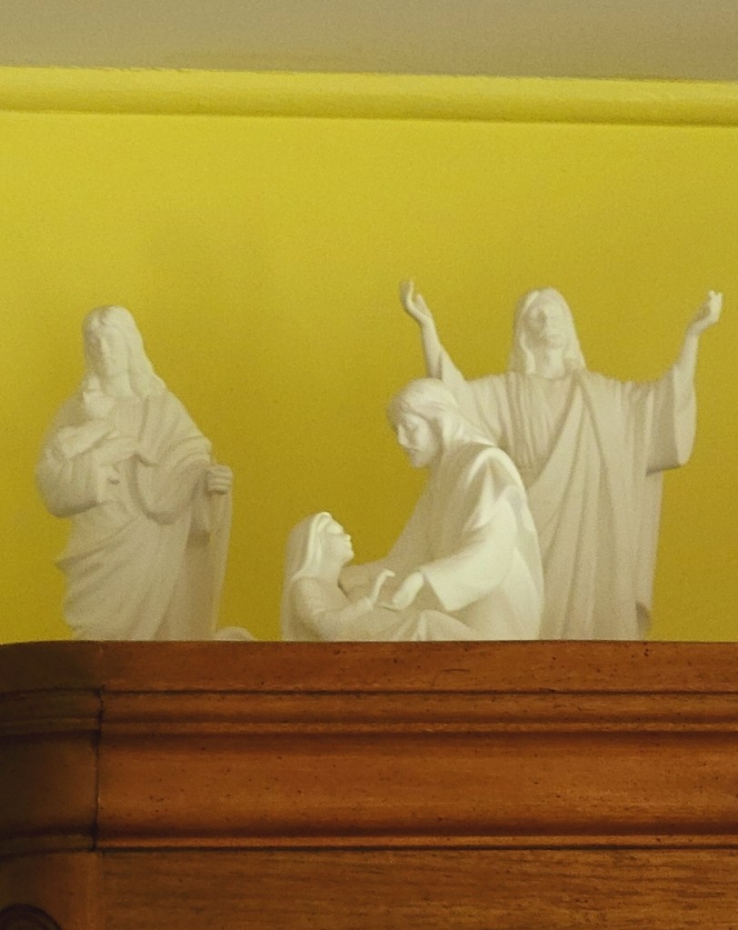 And now, with my last day today to eat the camp crumbles back at home, with morning oatmeal nourishment, today will be the TWIX mini chocolate which is smooshed. In this, I am to remember, Lord, that as squished and smooshed our lives seem to be, YOU DO NOT CHANGE and that You are just as much here at home just as You were at camp. We may be clouded and falling asleep sometimes from knowing You better, but here You are in the finishing crumbs of life. And of those crumbs, of eating some of those pretzels just now, I looked up and saw the best sight. On top of my kitchen cabinets are three Lenox statues with the most prominent one in the front: You and me – You Jesus and me Jarius’s daughter – being awakened from sleepy death into forever faith. Ah… He took her by the hand and said to her, “Talitha koum!” (which means “Little girl, I say to you, get up!”).