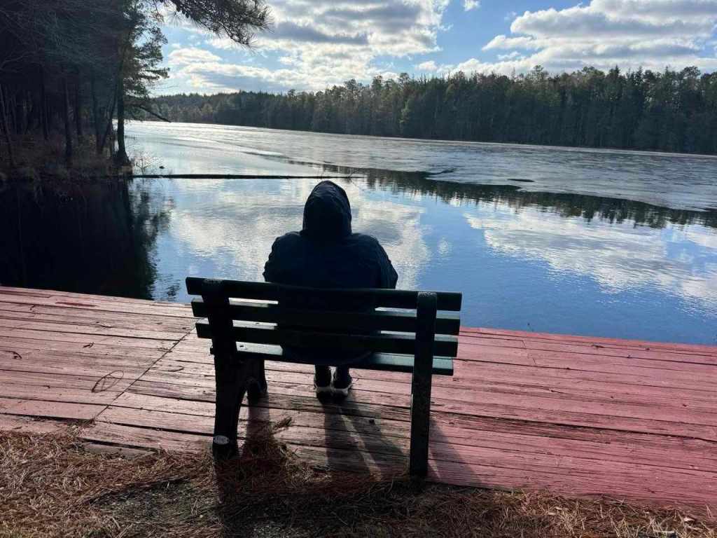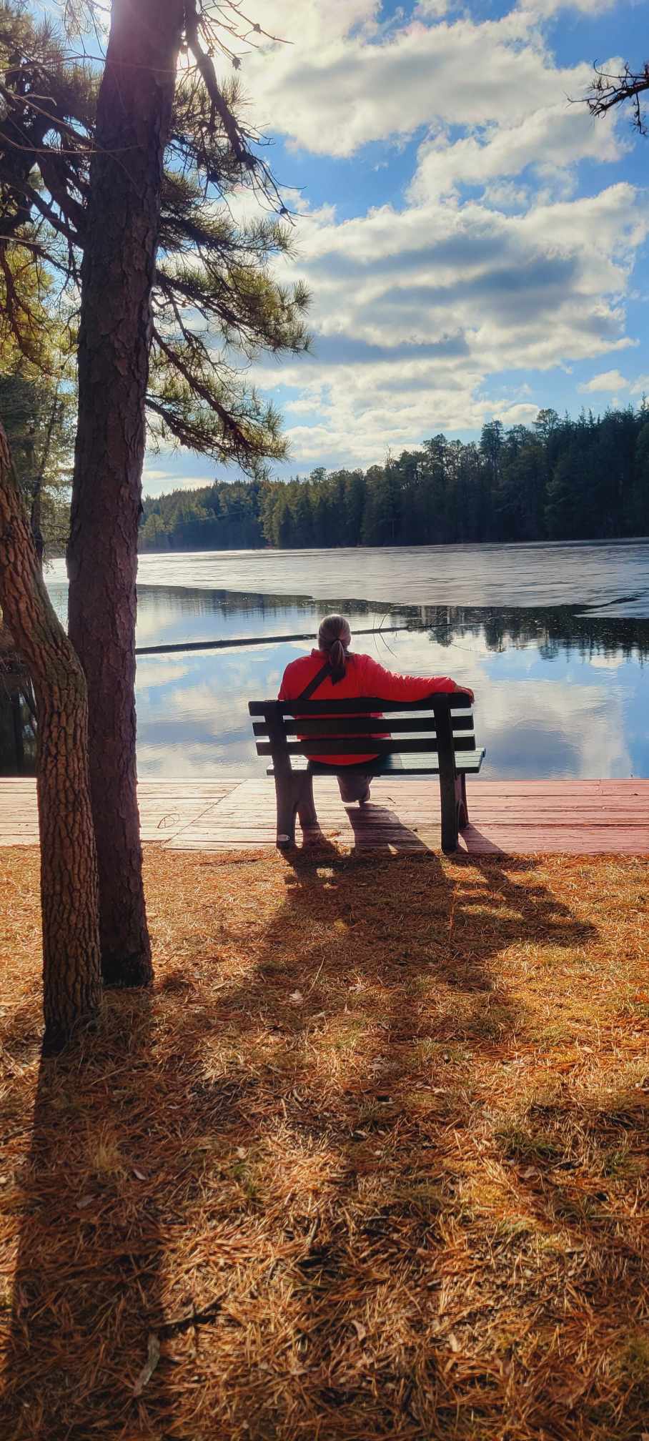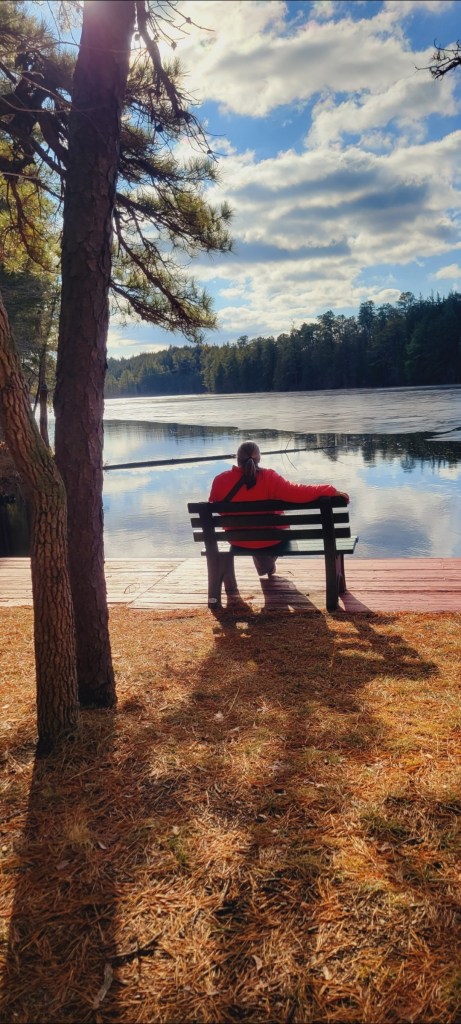 My friend and I took photos of each other sitting on the bench, looking out at the water, pondering life… but honestly it was just the briefest of pauses, not even a minute each. Looking at the photos now gives us the time to ponder the moment and the lack of mayhem just then, but we quickly moved on as we were walking around the small lake with the scout campers.