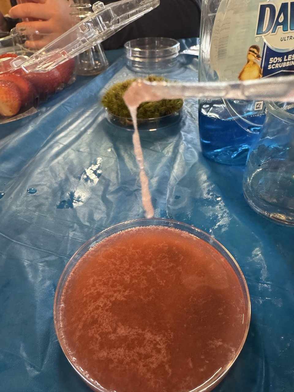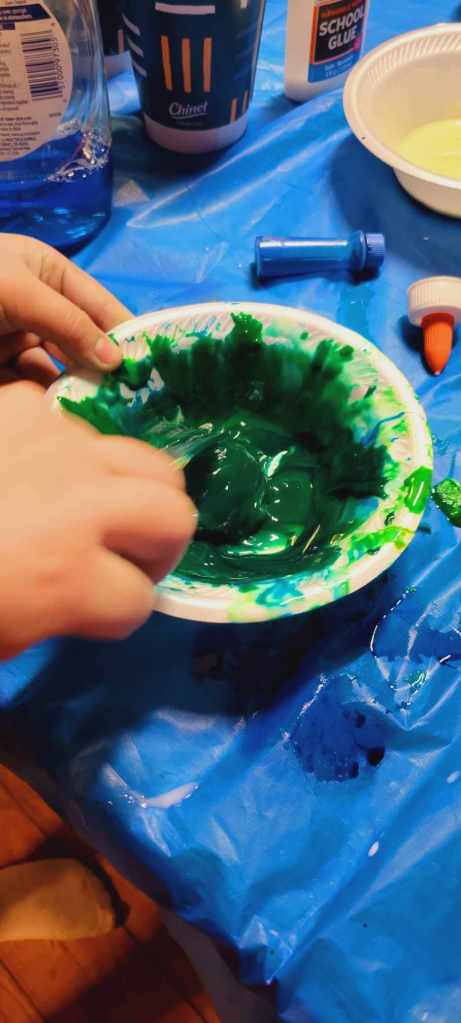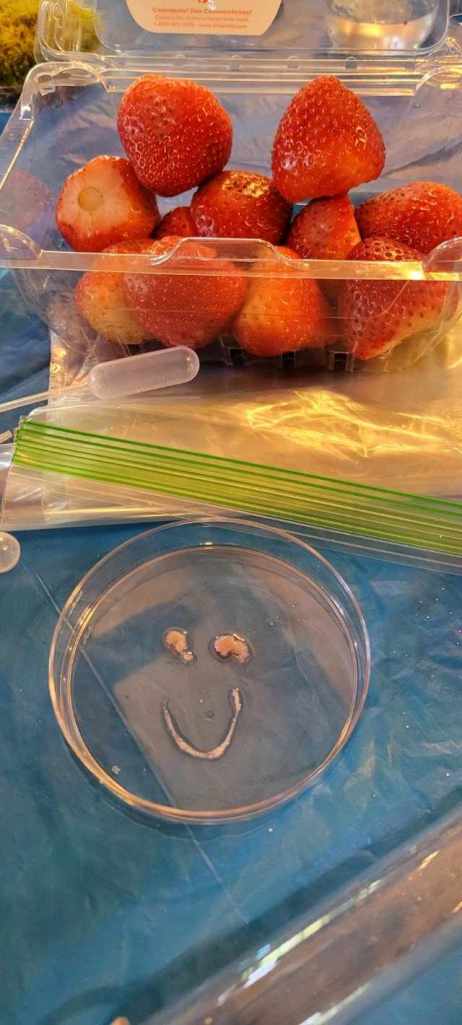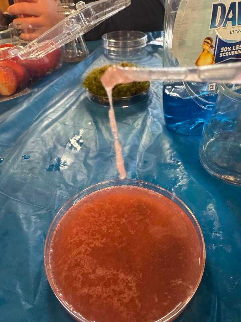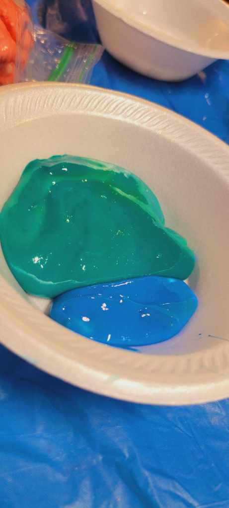 Nature hikes and science experiments and painting and card games and Bananagrams and bracelet making. We took a hike around the lake and later a few of us went to where the littlest Daisy girls were staying. You realize how BIG the little girls are when there are even littler younger ones there – and what a joy for me to see 4 of our girls run two science experiments for the littlest ones at their cabin. We enjoyed isolating strawberry DNA, making slime, making homemade playdough, making pH color changes for the red cabbage juice with vinegar and baking soda. They were really good to go with the slime and the elephant toothpaste experiment too – once it was set up the girls had free reign – this is camp and yes you can trust them with food coloring and controlled messes… it all washes…