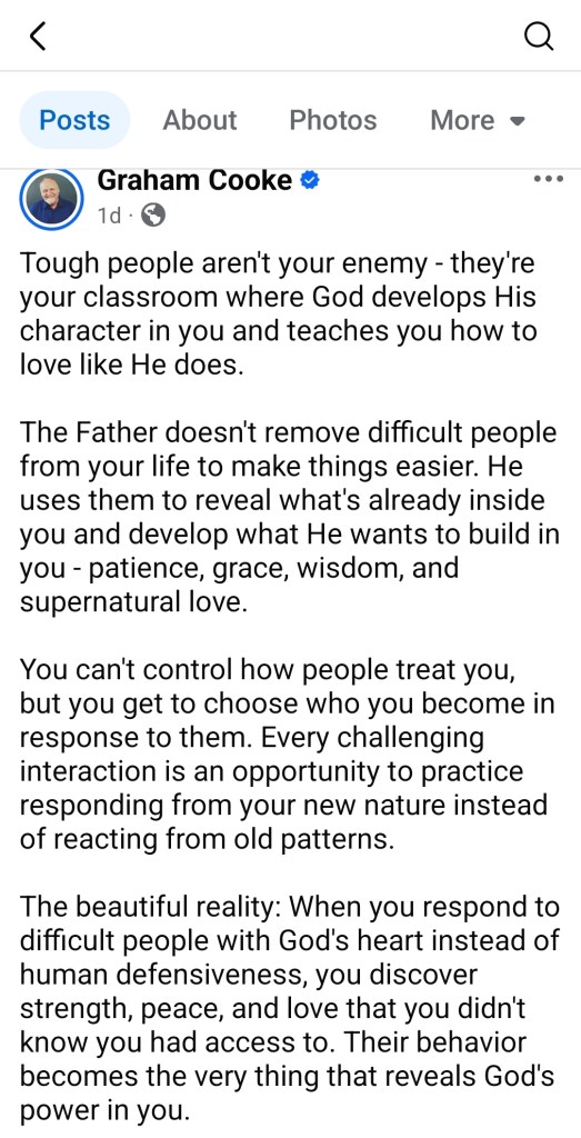 I do not know the author Graham Cooke, but I do trust my friend’s suggestion. And I find the post fiercely spiritually spot on: “Tough people aren’t your enemy – they’re your classroom where God develops His character in you and teaches you how to love like He does.”