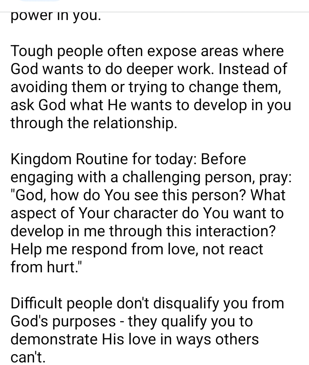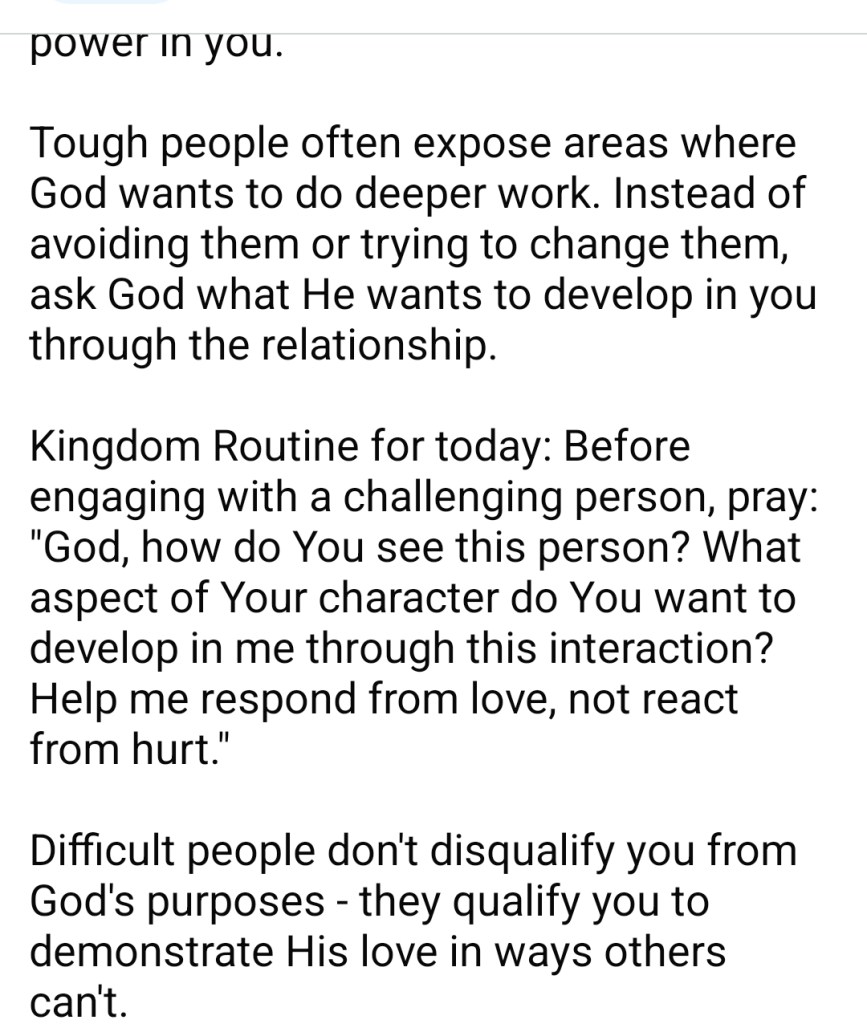 “Kingdom Routine for today: Before engaging with a challenging person, pray: “God, how do You see this person? What aspect of Your character do You want to develop in me through this interaction? Help me respond from love, not react from hurt.”