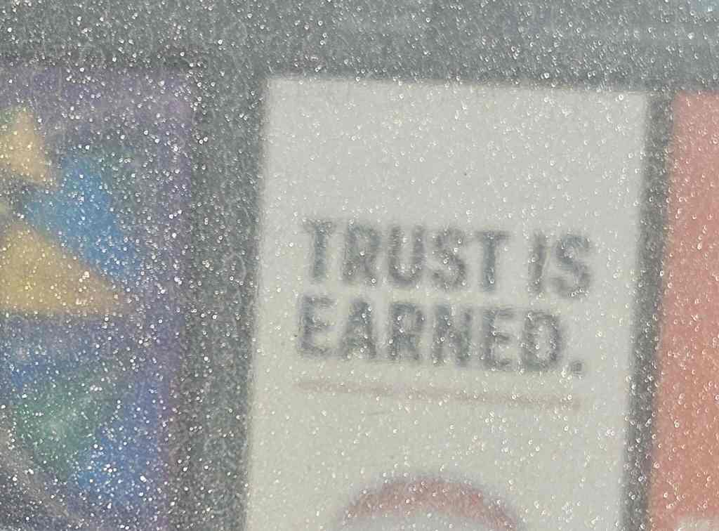 I left home the book I am reading for a work bookclub, about TRUST, but the CONCEPT OF TRUST is contained in my mind and of course I had to take a photo of a billboard I saw while on the train about a business where “TRUST IS EARNED”. We need that…