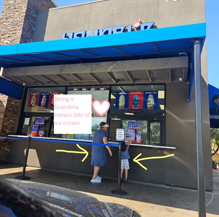 And yeah – that is what half my vacation was – even though evenings were for Vegas thrills, – the mornings were also blessed – being with a 4yr old, and an 18-month yr old and sitting on the floor and playing blocks – and chicken nuggets and making a cheese quesadilla for the little girl, just like I made 20 years ago for my oldest…  Yes, time with kids reminded me how long ago I had mine – and oh it reminded me of the kids back home who are now both over 21 – both driving – both adulting – and how time flies… We raise kids and then we raise adults…  And we should take time to BE with the kids when they are little – because it makes THEIR childhood more idyllic to have love – and yes get ice cream and yes play in the dirt and then a hose in the backyard (and THANK GOD I can still get down to sit on the floor at their level)…  And our trip to the McD’s playground inside and our trip to get a haircut for the 4 year old – amazing – (that is what pleases a grandma all the world around: a haircut!) – and seeing joy in making a connection with the hairdresser (from Ohio too like the ice cream). And yes our other trip to Dairy Queen near the Hoover Dam in Boulder City – with chocolate dipped vanilla ice cream – yum (all while keeping the kids in the car – remember those days?) – and our trip to see the blue caboose of the old time railroad from our car windows (not getting out of the blessed Air Conditioning at 116F)… and playing in a dirt pile at the construction corner – and seeing the kitties  – and vacation is being a kid as an adult (with your own money now and ability to buy ice cream) and seeing the blessed newness in their eyes and in your heart. Being on vacation means changing your mindset too. And accepting a new season of life for temporary. And making memories that last longer than the photos. Yeah – that is what vacation can be…  Memories…
