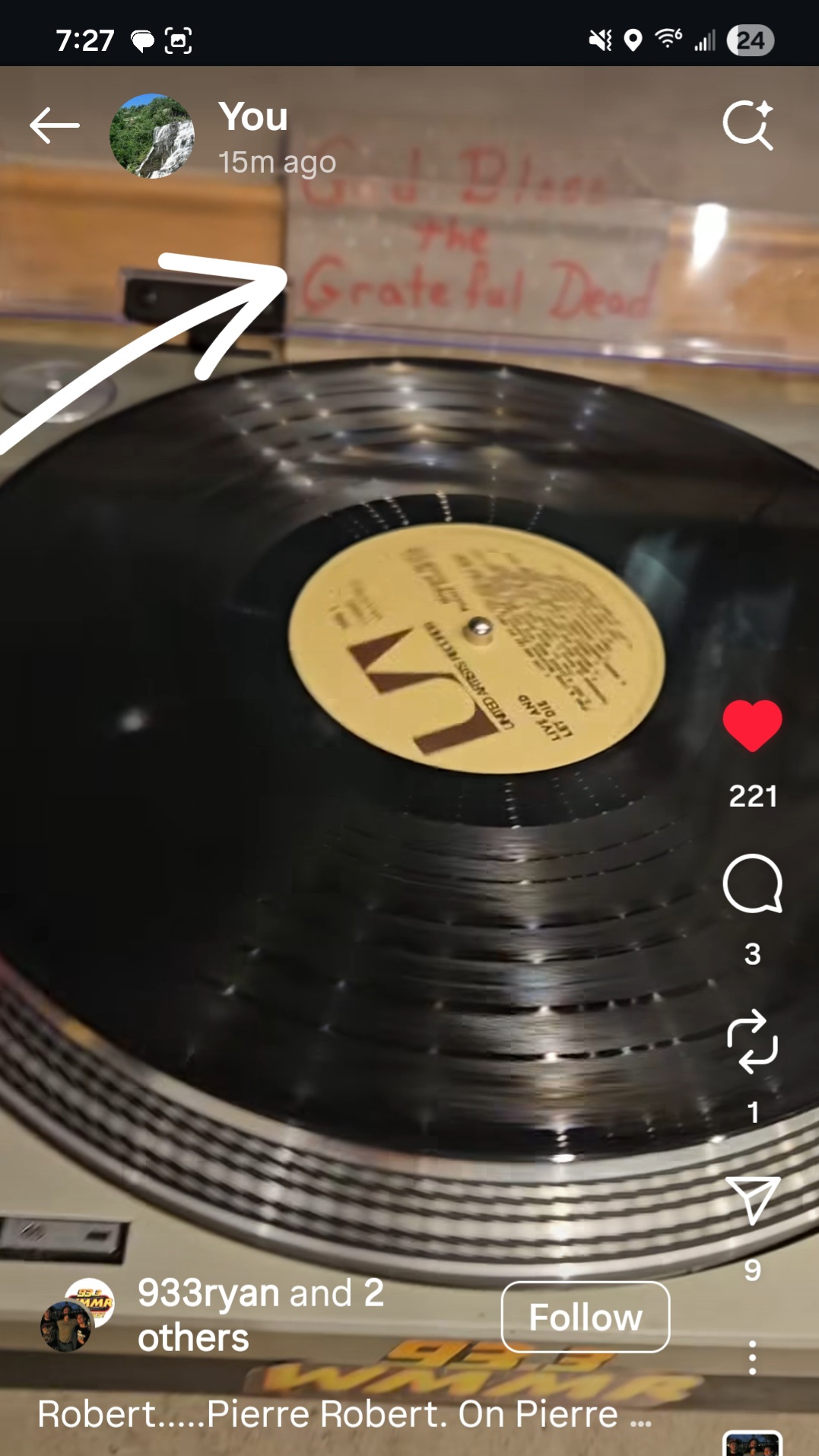 No mistake to me at this moment of scrolling that this was a “sign from God”.  This is a handwritten stone plaque that I made and then gave to fellow DJ Jacky BamBam to deliver, which I handed over at a meet and greet in 2024 and which he promised to deliver) – it made it there. It is actually propped up behind the vinyl record player at WMMR in their vinyl cut station at the Pierre Robert studio… WOW!!!! Pierre would have seen it every day, perhaps for up to a year (others too – and now see it on social media)… WOW!!!
