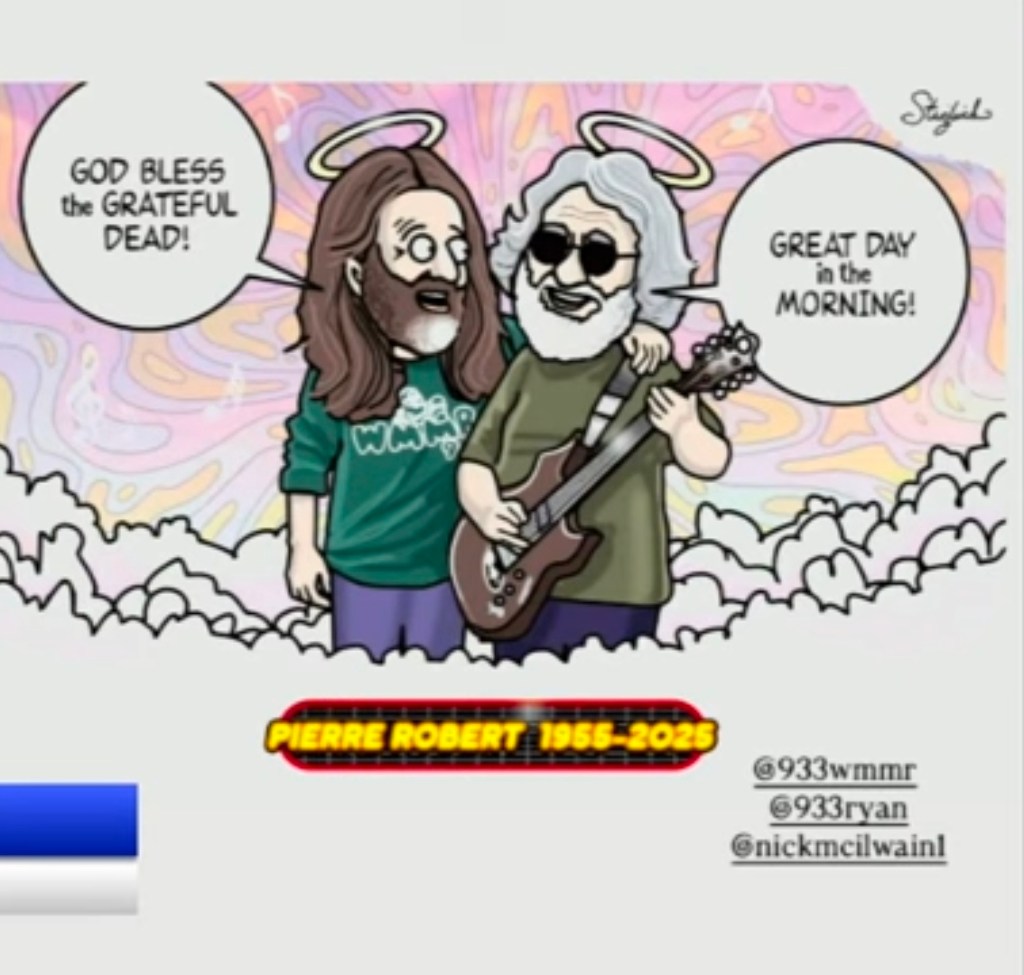Like the placard stone sign – a plaque now in a public space – I have to say “God bless the Grateful Dead” – God bless Pierre – God bless Jacky and all the staff at the radio – God bless the day – God bless the friends through scouts – God bless the farm – God bless the beautiful day and realizing it – and God bless the knowledge of God in everything we want to do…