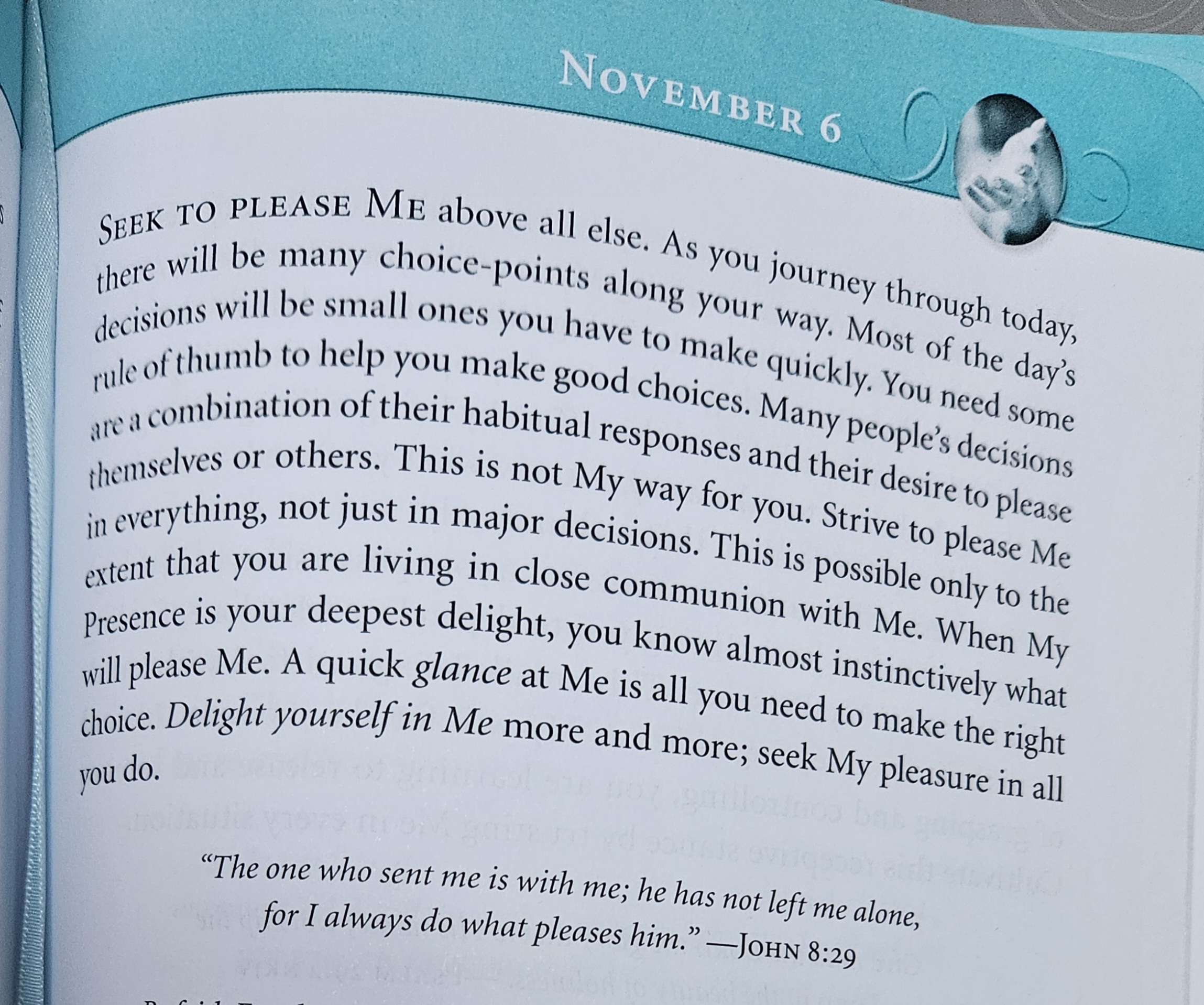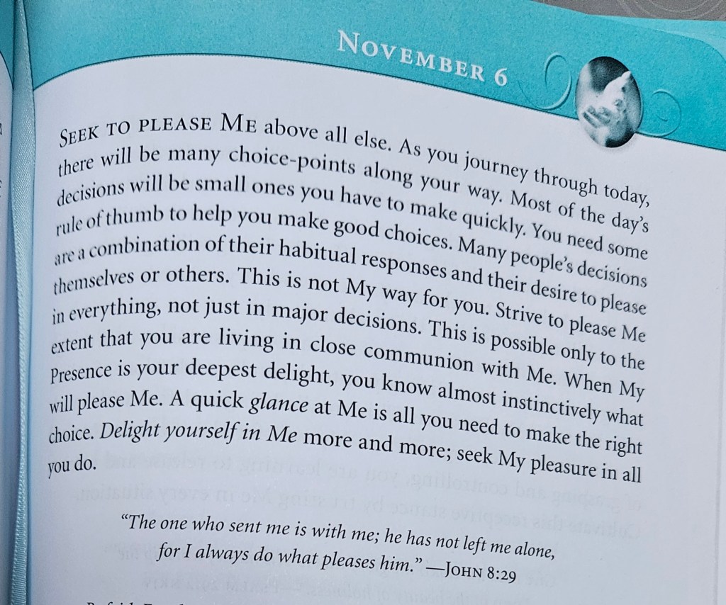 “Seek to please Me above all else. As you journey through today, there will be many choice-points along your way. Most of the day’s decisions will be small ones you have to make quickly. You need some rule of thumb to help you make good choices. Many people’s decisions are a combination of their habitual responses and their desire to please themselves or others. This is not My way for you. Strive to please Me in everything, not just in major decisions. This is possible only to the extent that you are living in close communion with Me. When My Presence is your deepest delight, you know almost instinctively what will please Me. A quick glance at Me is all you need to make the right choice. Delight yourself in Me more and more; seek My pleasure in all you do.”
