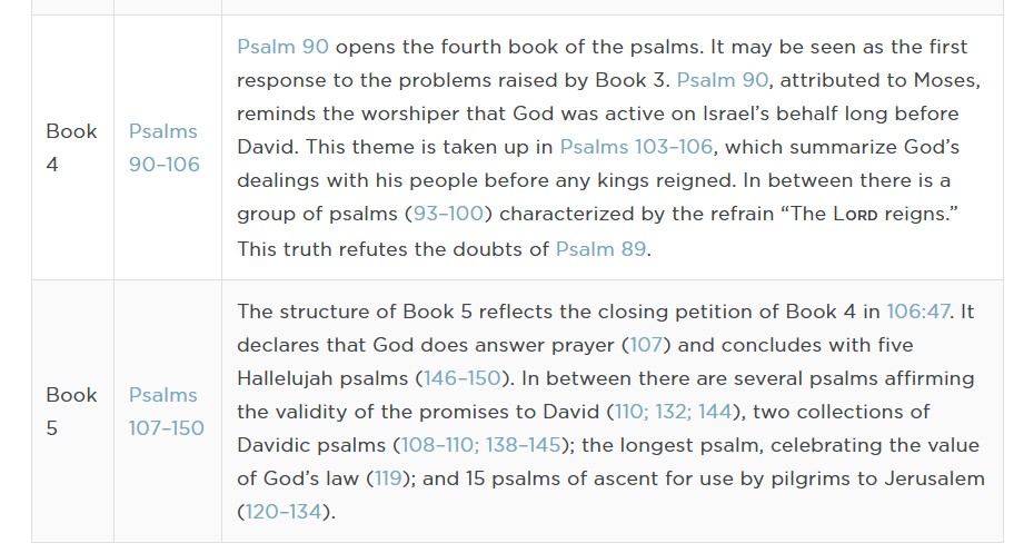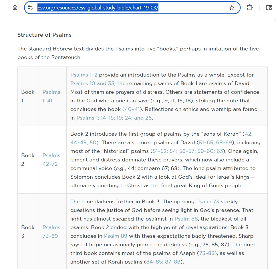PS – although I have read the whole bible – I needed help and structuring to learn how it is organized is crucial – for example here are helps in how the psalms are structured into 5 “books”  https://www.esv.org/resources/esv-global-study-bible/chart-19-03/ )