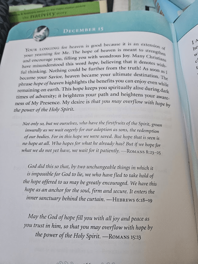 Your longing for heaven is good, because it is an extension of your yearning for Me. The hope of heaven is meant to strengthen and encourage you, filling you with wondrous Joy. Many Christians have misunderstood this word hope, believing that it denotes wishful thinking. Nothing could be further from the truth! As soon as I became your Savior, heaven because your ultimate destination. The phrase hope of heaven highlights the benefits you can enjoy even while remaining on earth. This hope keeps you spiritually alive during dark times of adversity; it brightens your path and heightens your awareness of My Presence. My desire is that you may overflow with hope by the great power of the Holy Spirit.