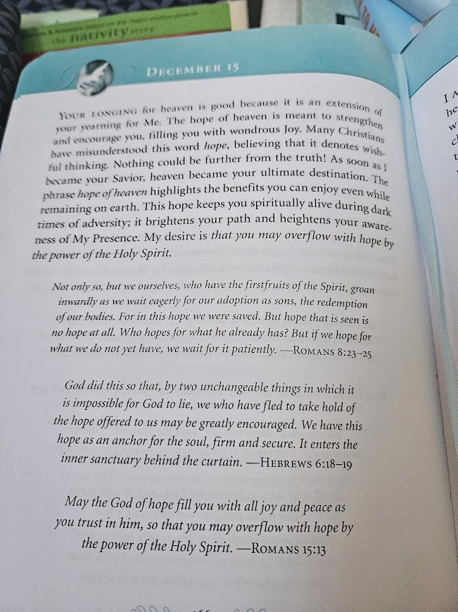 Your longing for heaven is good, because it is an extension of your yearning for Me. The hope of heaven is meant to strengthen and encourage you, filling you with wondrous Joy. Many Christians have misunderstood this word hope, believing that it denotes wishful thinking. Nothing could be further from the truth! As soon as I became your Savior, heaven because your ultimate destination. The phrase hope of heaven highlights the benefits you can enjoy even while remaining on earth. This hope keeps you spiritually alive during dark times of adversity; it brightens your path and heightens your awareness of My Presence. My desire is that you may overflow with hope by the great power of the Holy Spirit.