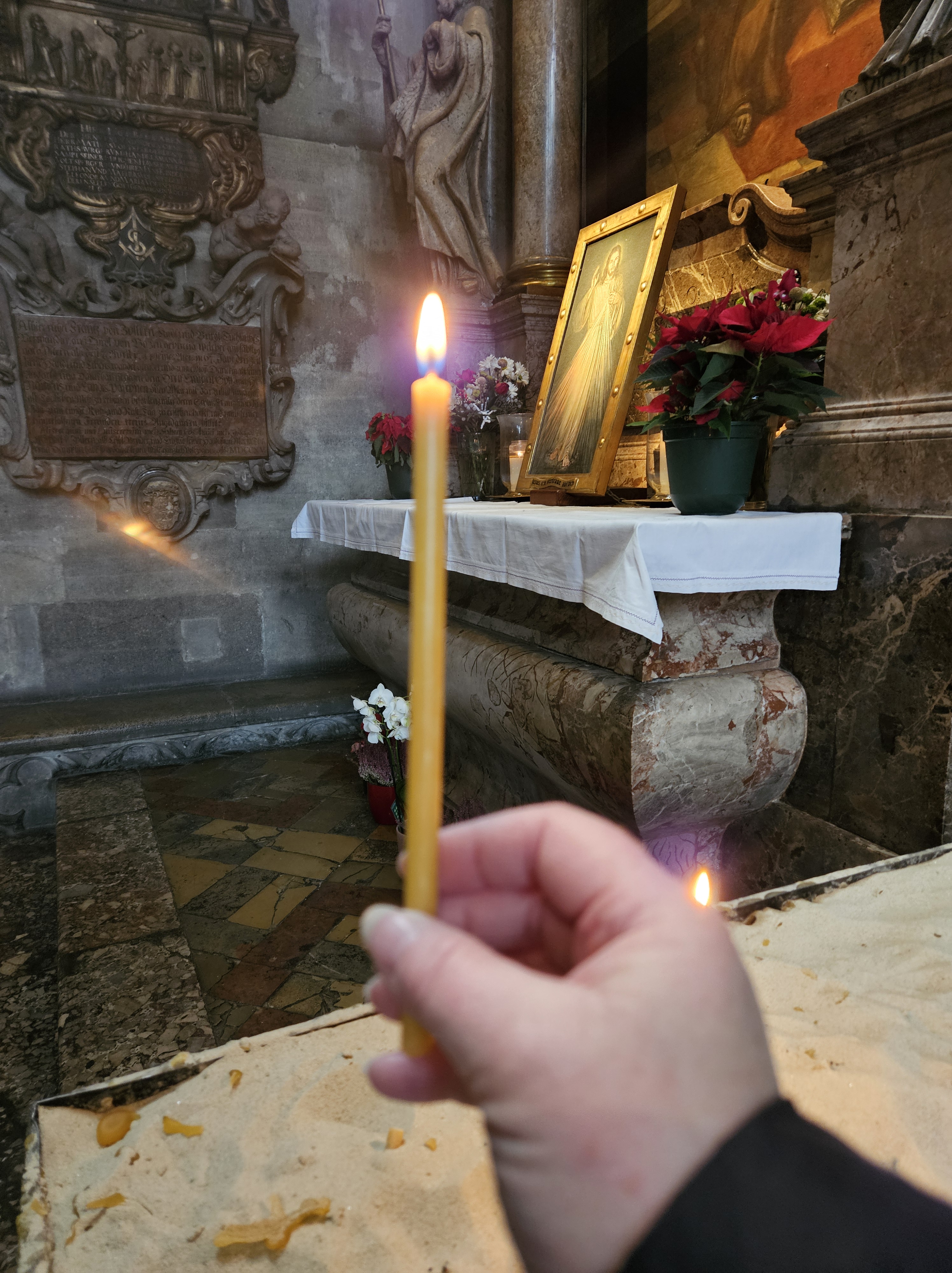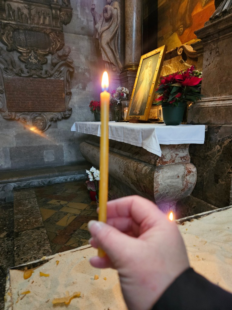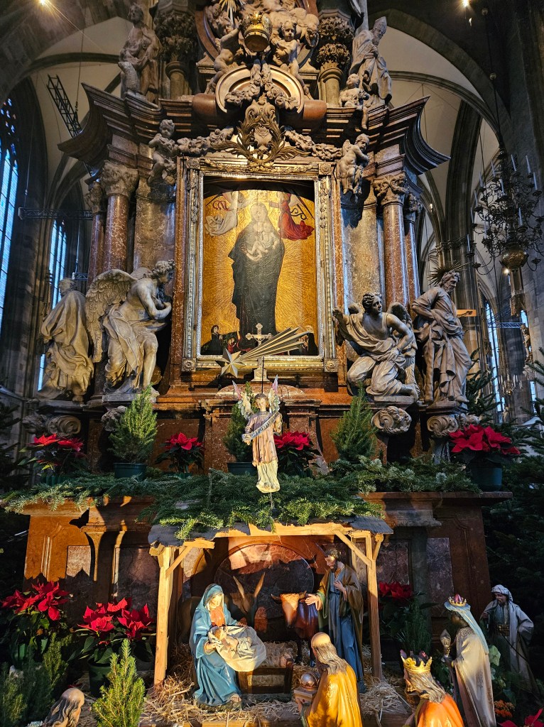 Quite the most BEAUTIFUL way to start the day, 8am arrival (2amEST) to Vienna Austria. YEAH, took the plane to the citytrain ($14euro) and walked right into St Stephen’s Cathedral… GORGEOUS… and the Wiseman are still at the creche, in awe like me… I also lit a candle for my friend , watching over us while holding Jesus’s Hand… AMEN…