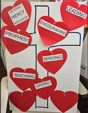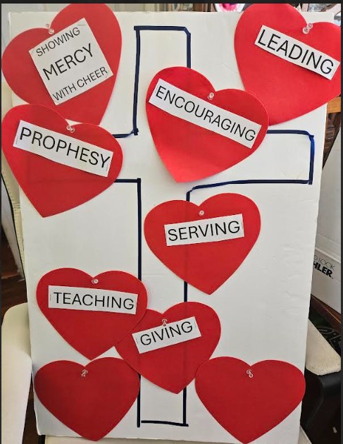 So let us take these gifts in love and do an activity to close with discussion – I have hearts of these gifts – and heart stickies – for you to write on and keep – let us first fill up the cross with our gifts – I handed out the large ones – could folks please affix them to the cross? Acknowledging that God gives us gifts to share and He went all the way to the cross to take our sins away so that we have no reason not to share His goodness of gifts.