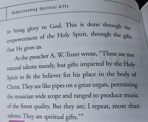 AND AS FOR A PROP TODAY – I WANT US TO THINK OF THESE GIFTS – how do we figure out our gifts – there are many spiritual gift “inventories” – read Tozer quote: