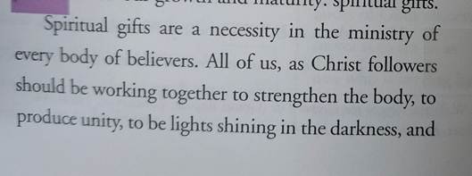 REMEMBER THE IN FAITH PART – THAT WE CAN’T JUST SHLUFF OFF THE GIFTS – OR THAT WE ARE NOT WORTHY – BECAUSE IT IS GOD WHO MAKES US WORTHY TO HAVE THESE GIFTS AND USE THEM – AND WE ARE HERE ON EARTH AS PART OF THAT ONE BODY – YES ALL OF US… Remember God uses the term that we are the BRIDE of the Church – being made ready for our Groom.