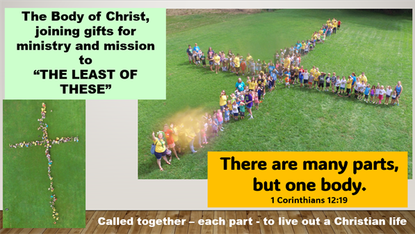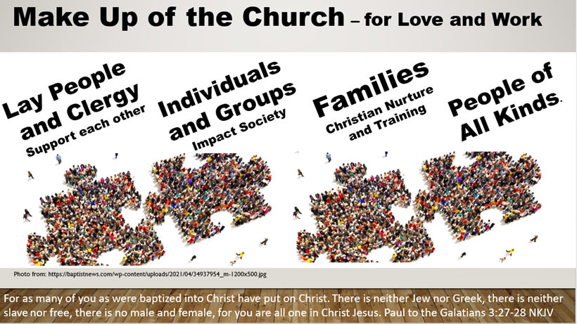 (Point to the slide) The one body of the church is made for love and for work – and includes lay people and clergy who support each other; individuals and groups who can impact society; families for Christian nurture and training; people of all kinds!