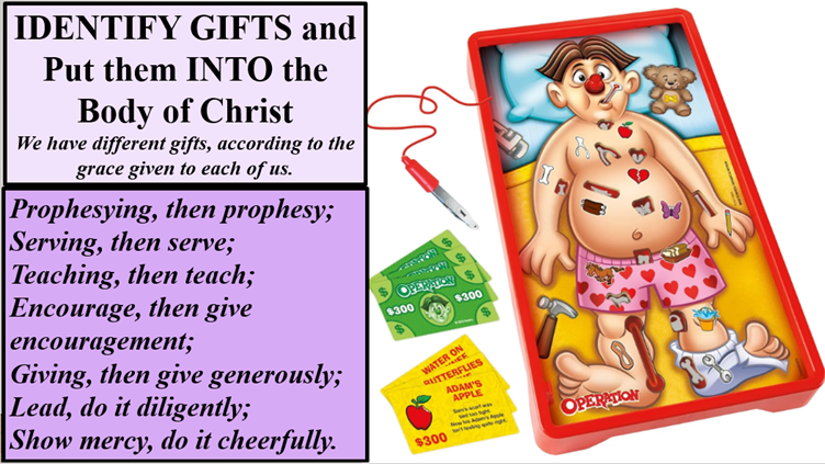 AND WHAT ABOUT THIS BODY OF CHRIST – I USE THIS JOKE OF THE OPERATION GAME WHERE YOU TAKE OUT THE PARTS – BUT LET US THINK IN REVERSE – PUT YOUR GIFTS INTO THE BODY OF CHRIST!