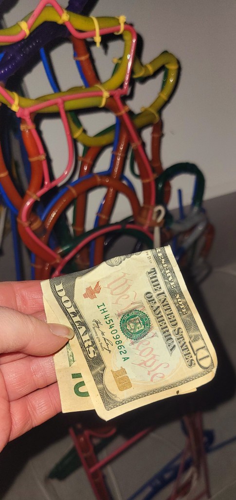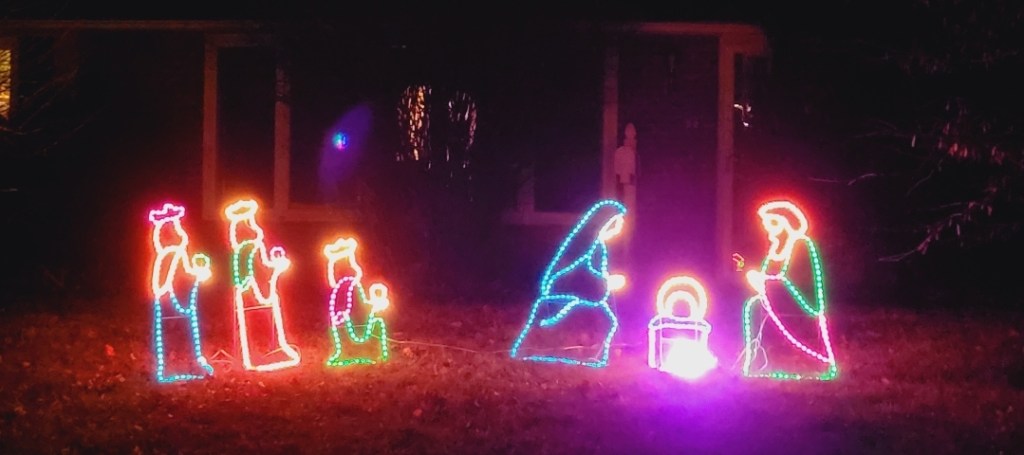 So, also this week I was picking up my outside knocked-over neon nativity decorations after a windy wet storm. There was a ten dollar bill blown up the hill, sitting in front of a king! Wow, a king that delivers! And I thought what would Jesus’s family have used those gifts for, of Gold, Frankincense and Myrrh? Were they symbolic gifts? Practical gifts? Both? And what should I spend this 10 dollars on?! It’s cool, but 10 dollar 50 years ago would have bought a lot more! What would it be in Jesus’s time? Things change. Jesus doesn’t, but times do. I will think about this ten dollars – perhaps it like taxes and toll bridges are needed to be paid and the Lord provides that too (just ask Peter and that fish). Isn’t it good that Jesus paid the price for our toll toiling life bridge to Heaven too?