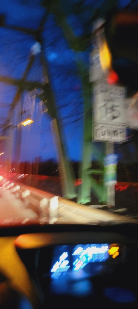 Look, I didn’t even have time for a proper photo as traffic stopped and then decided to go. Another time I had plenty of time stuck in the middle of the bridge for a day photo of the awesome trusses. Every rush hour this FREE (once toll) bridge is packed. Trust me the horses would have had a faster crossing on foot on the sidewalk! No, no one walks across on the sidewalk anymore either! And I’m old enough and young enough to say “Remember when people walked to work, school, groceries?”… yeah life’s a blur.
