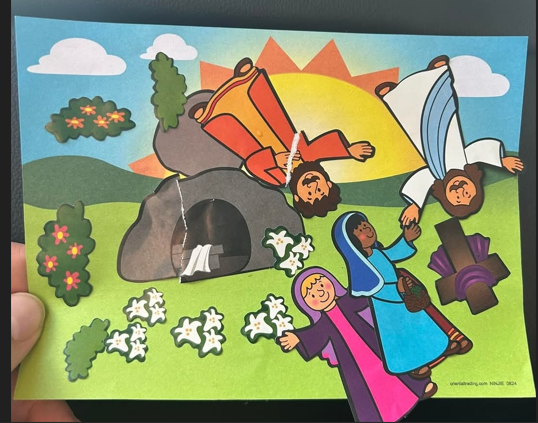 Well, I want you to find the three colorful fringed pieces of paper – each person gets one orange, one yellow and one white… each person also gets a brown or black base… On these colorful pages, you will find old testament and new testament scriptures about LIGHT – what the LIGHT means – how we share – Who God is – and about faith…